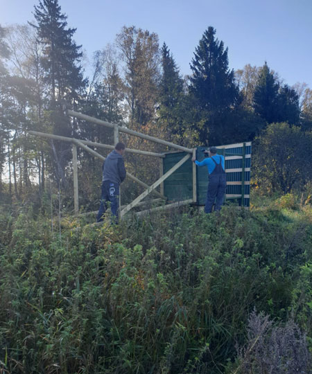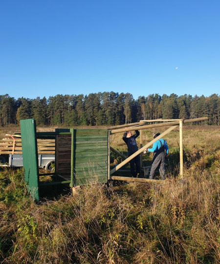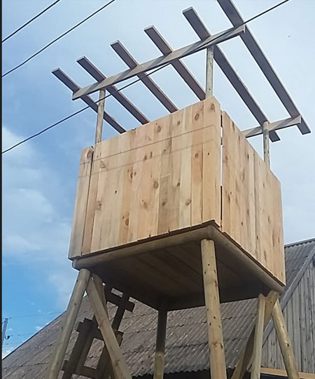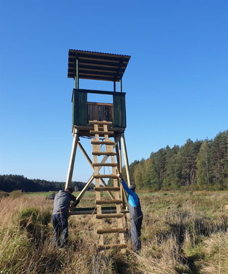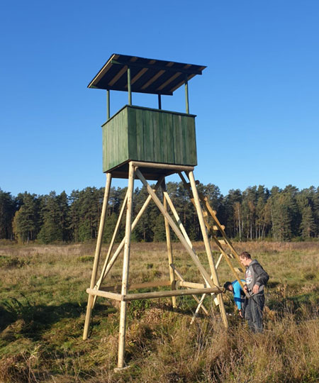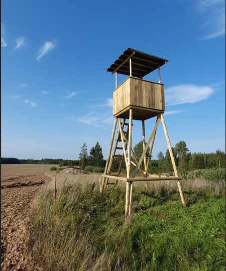 Kvalitatīvs koka medību tornis ar atvērtu platformu, piemērots medībām un dabas novērošanai. Tornis izgatavots no impregnēta koka, ar stipru konstrukciju un jumtu aizsardzībai pret nokrišņiem.